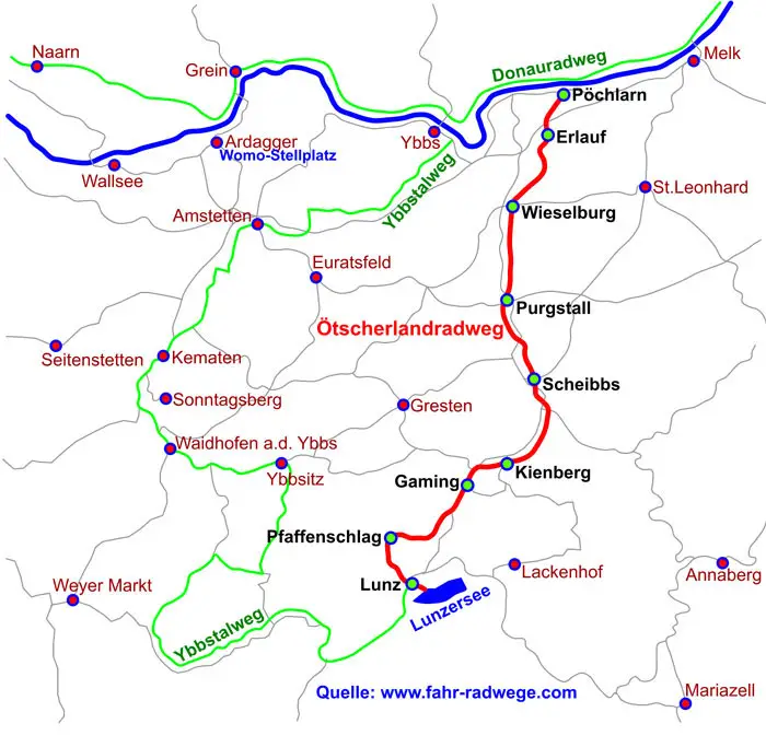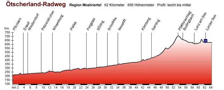 Der Ötscherland Radweg zweigt bei Pöchlarn vom Donauradweg ab und führt entlang des Erlauftals über die Orte Wieselburg, Purgstall, Scheibbs, Gaming, Pfaffenschlag und Lunz nach Lackenhof.